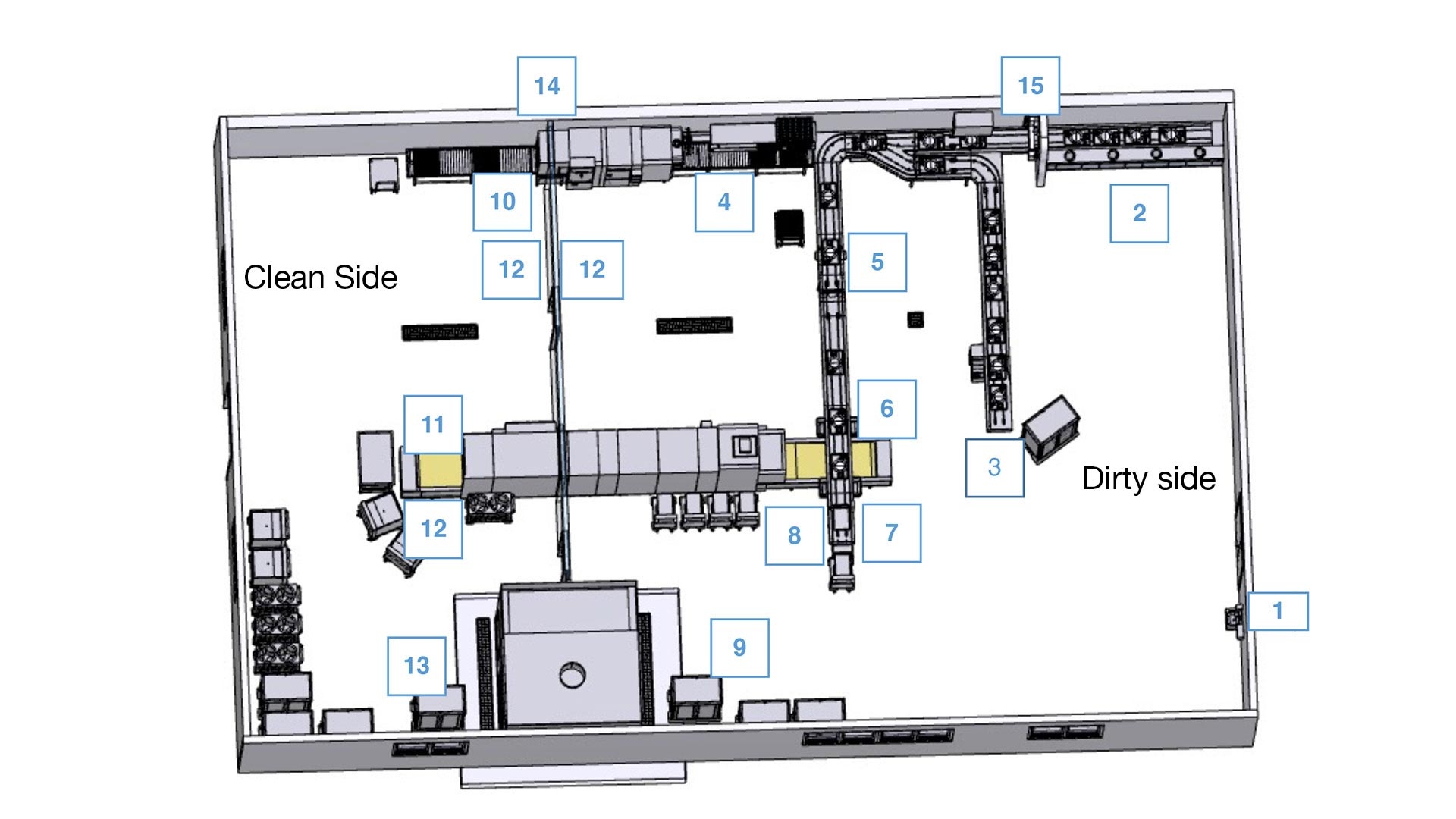 - Hand washing and sanitising options or the opportunity to change gloves must be provided on the dirty/clean side (12).